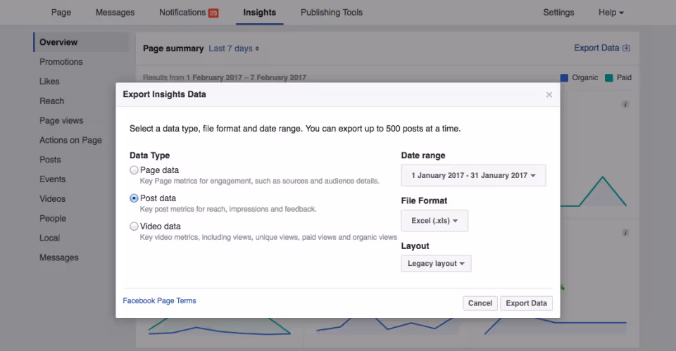 For starters, click on ‘Export Data’ and exporting ‘Post Data’. This will show you key information on individual post, such as reach and engagement. But of course, feel free to play around with your Page insights – there is a lot there to explore.